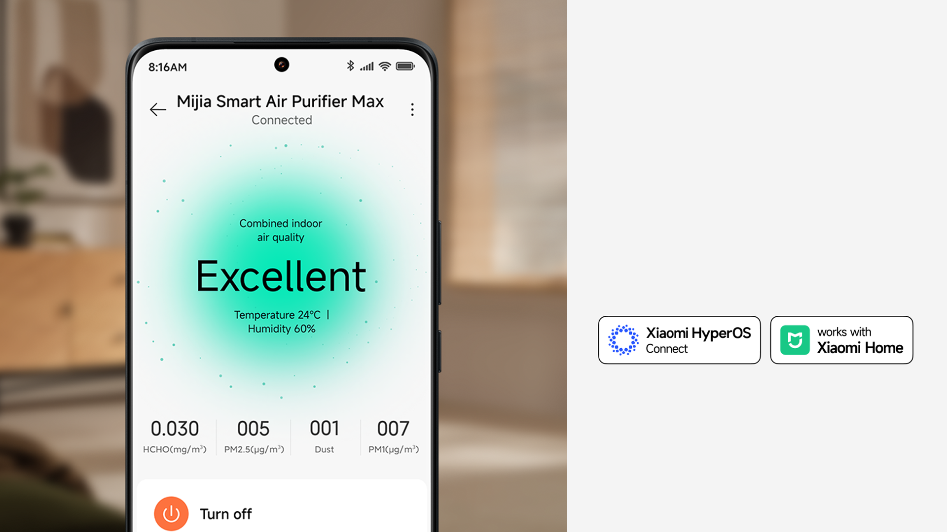 Mijia Smart Air Purifier Max je vybavená aj intuitívnym farebným LCD displejom, ktorý vám v reálnom čase zobrazí aktuálnych stav ovzdušia a umožní jednoduchšie ovládanie zariadenia. Má v sebe aj inteligentný senzor, ktorý presne reaguje na zmeny hladiny formaldehydu v ovzduší, aby ste doma dýchali vždy len bezpečný vzduch.