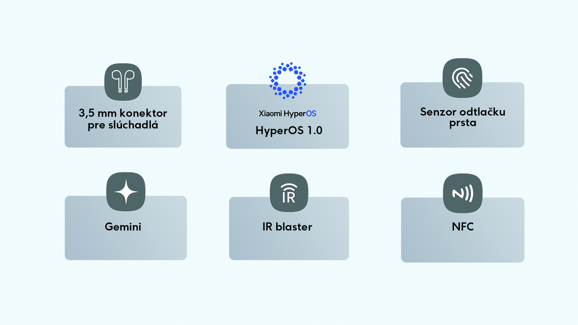 POCO M7 Pro ponúka veľké množstvo ďalších funkcii, ako napríklad inteligentný AI hlasový asistent Google Gemini, IR blaster, NFC, snímač odtlačkov prstov v displeji a 3.5mm audio jack. *Gemini je ochranná známka spoločnosti Google LLC. Mobilná aplikácia Gemini je k dispozícii vo vybraných zariadeniach, jazykoch a krajinách. Vyžaduje sa pripojenie k internetu.