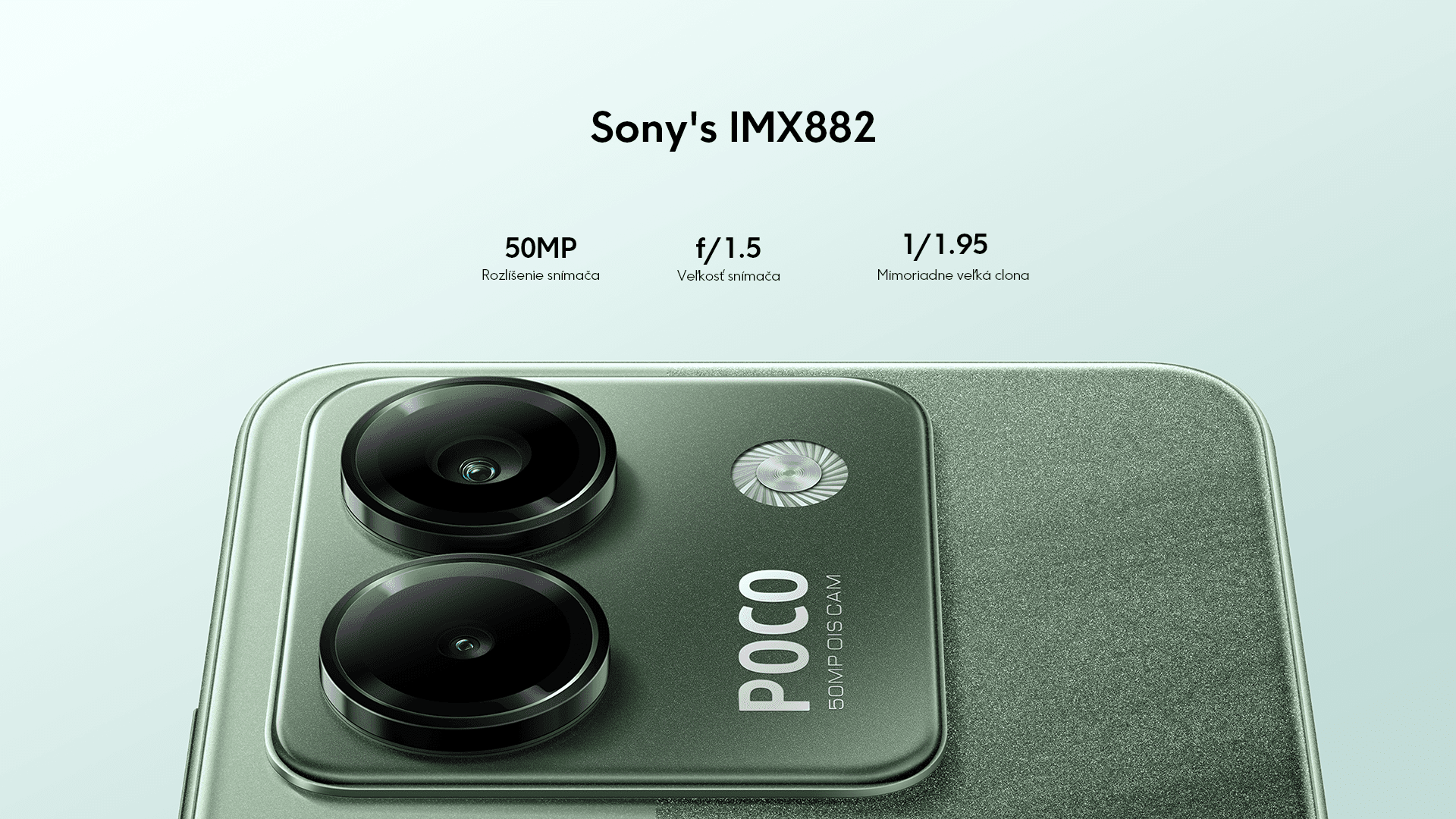 50MPx hlavný fotoaparát využíva senzor IMX882 značky Sony, ktorý ponúka veľkú clonu f/1.5 s veľkým prísunom svetla pre vynikajúci bokeh efekt a dokonalé portréty. O 29,8% väčší príjem svetla umožňuje úžasné portréty a nočné fotografie. Je vybavený optickou aj elektronickou stabilizáciou obrazu pre lepšiu stabilitu a novým 2-násobným optickým zoomom s AI algoritmom. *Údaje pochádzajú z interných laboratórií POCO na základe príjmu svetla jednotlivých pixelov.
