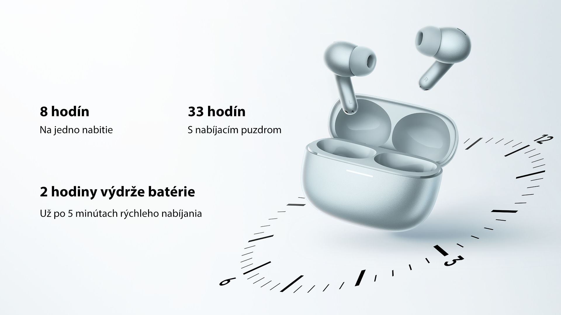 Slúchadlá ponúkajú až 8 hodín počúvania na jedno nabitie a až 33 hodín s nabíjacím puzdrom. Dlhá výdrž eliminuje obavy z vybitej batérie. Vďaka rýchlemu nabíjaniu získate za 5 minút nabíjania až 2 hodiny počúvania.