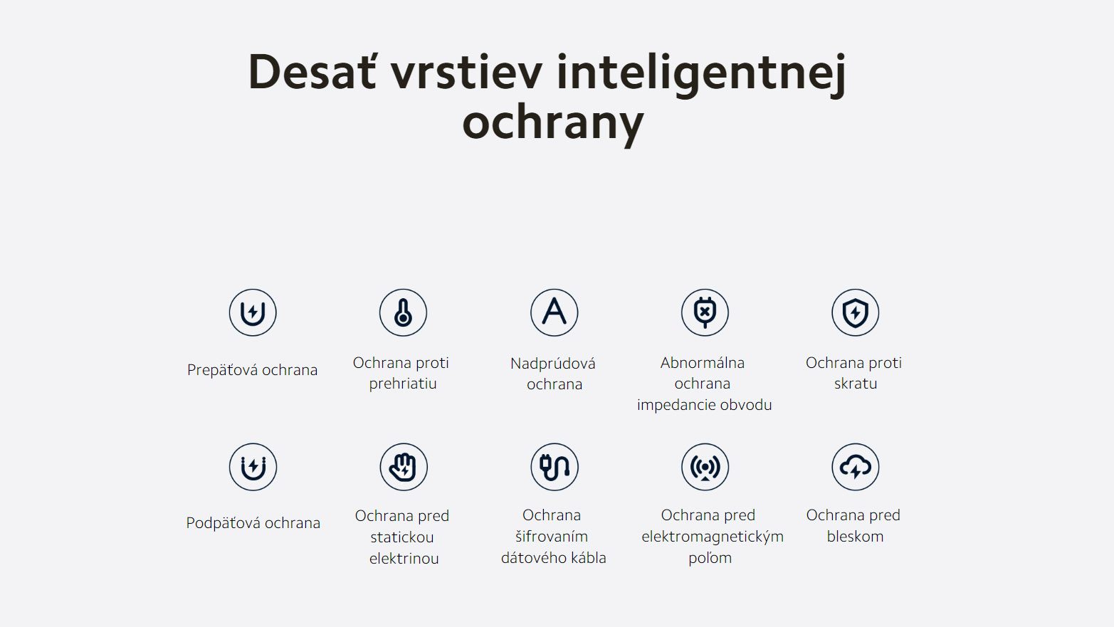 Desať vrstiev zabudovanej inteligentnej ochrany: ochrana proti skratu, nadprúdová ochrana, ochrana proti prepätiu, ochrana proti prehriatiu, ochrana proti podpätiu, inteligentná regulácia teploty atď. Desať vrstiev zabudovanej inteligentnej ochrany dokáže zabezpečiť rýchle nabíjanie v rámci normálneho rozsahu prevádzkového prúdu.