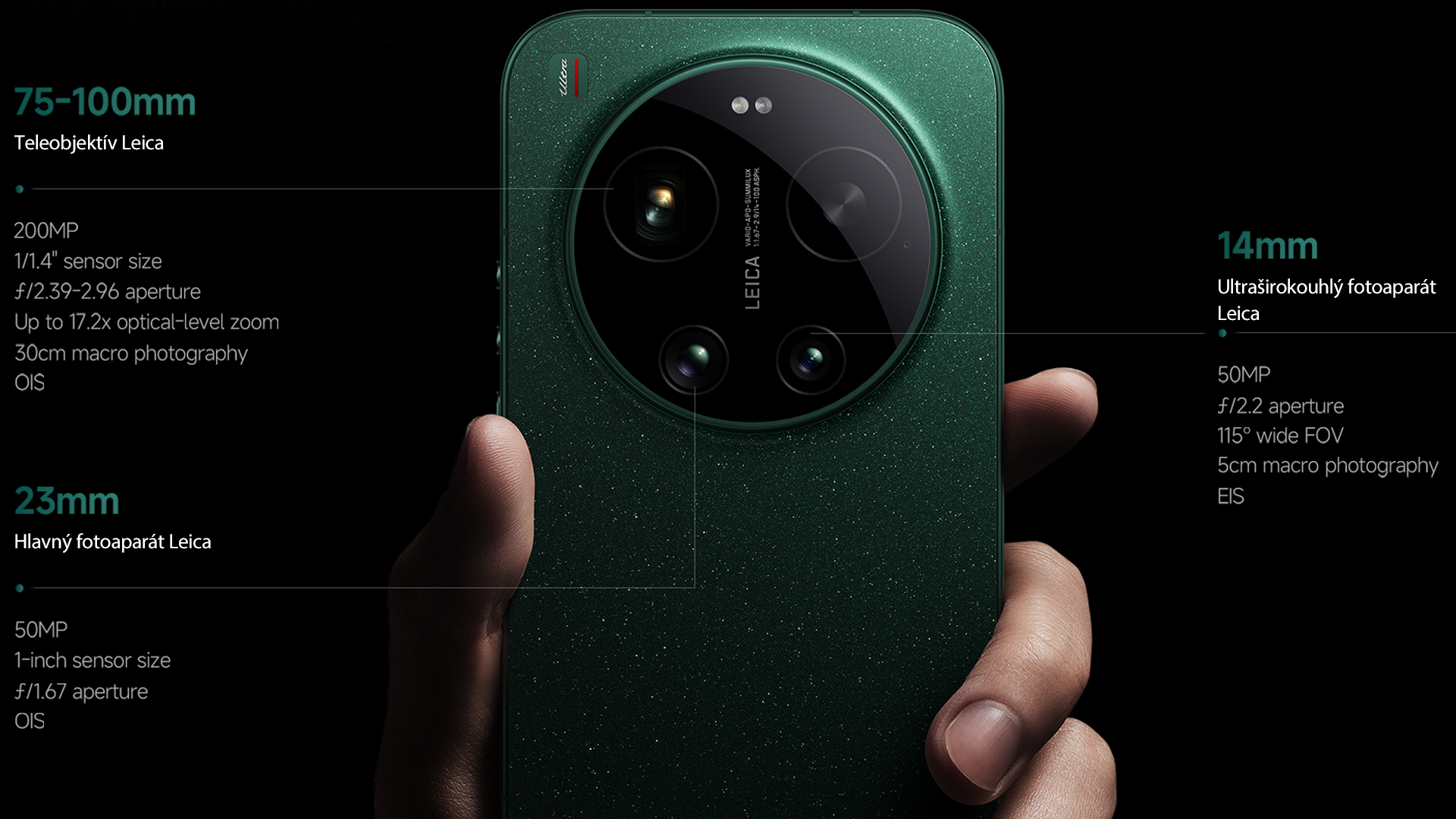 Zoznámte sa s trojicou fotoaparátov Leica na čele s hlavným 50MP fotoaparátom s veľkým 1-palcovým snímačom Light Fusion 1050L a 23mm objektívom (ƒ/1.67, OIS). Ten dopĺňa špičkový 200MP telefoto objektív Leica s nastaviteľnou ohniskovou vzdialenosťou v rozmedzí 75-100mm (ƒ/2.39-2,96, OIS, 30cm macro) a 50MP ultra-široký fotoaparát so 14mm objektívom (115° FOV, EIS, 5cm macro).