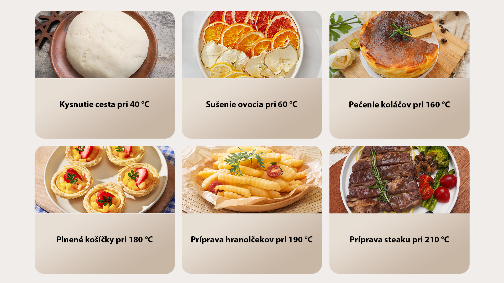 40°C: Ideálne na rozmrazovanie, výrobu jogurtov, kysnutie cesta alebo sušenie ovocia.