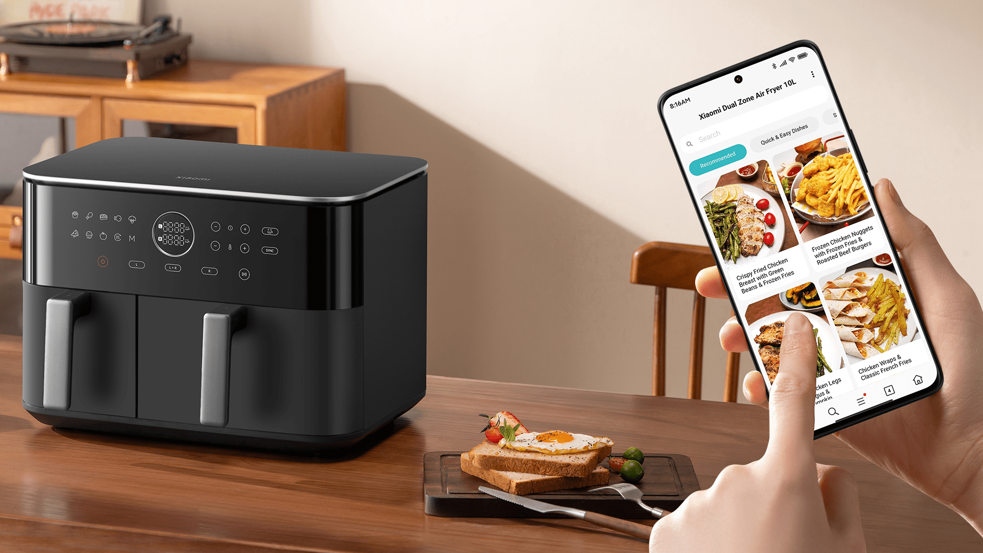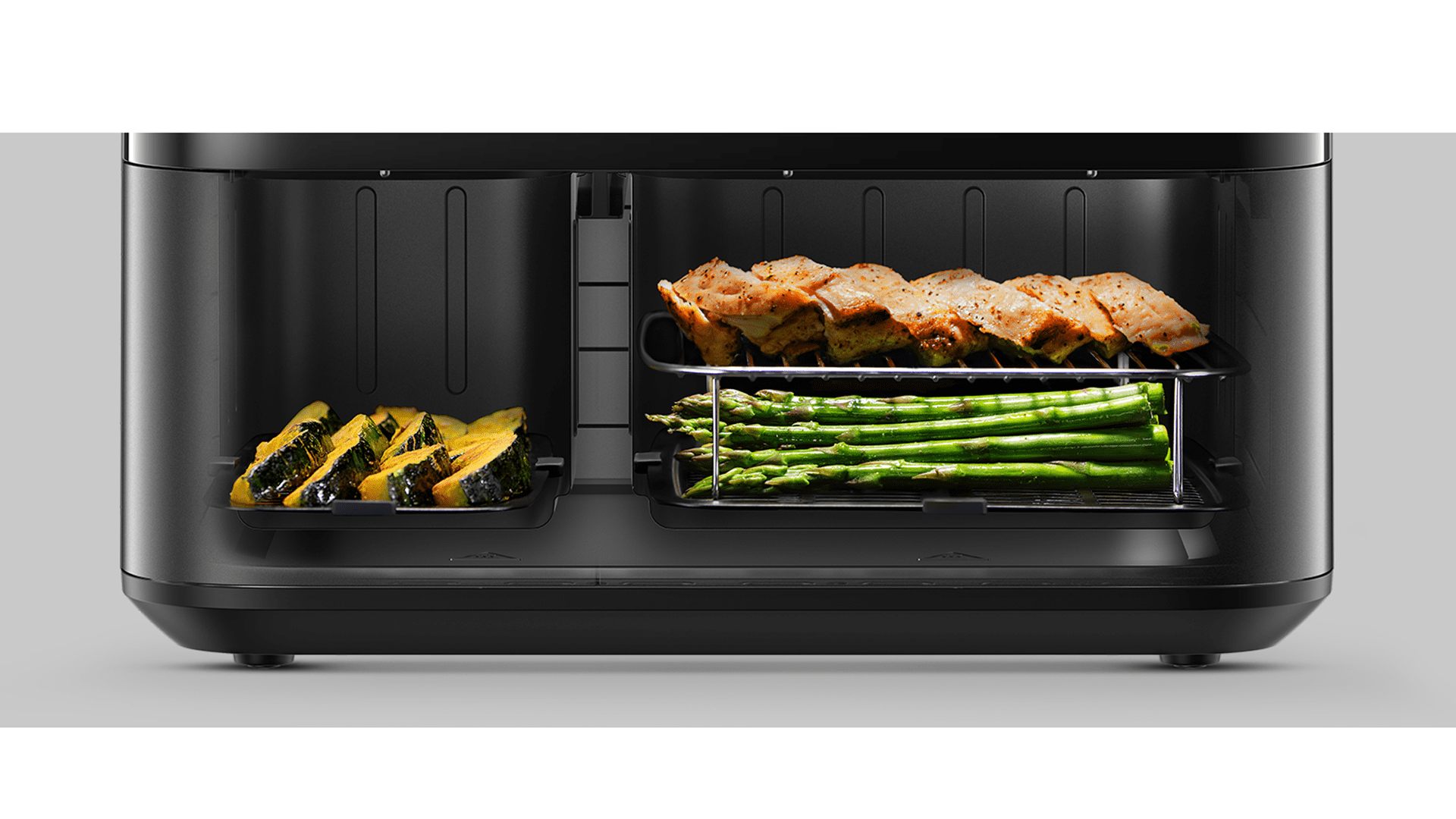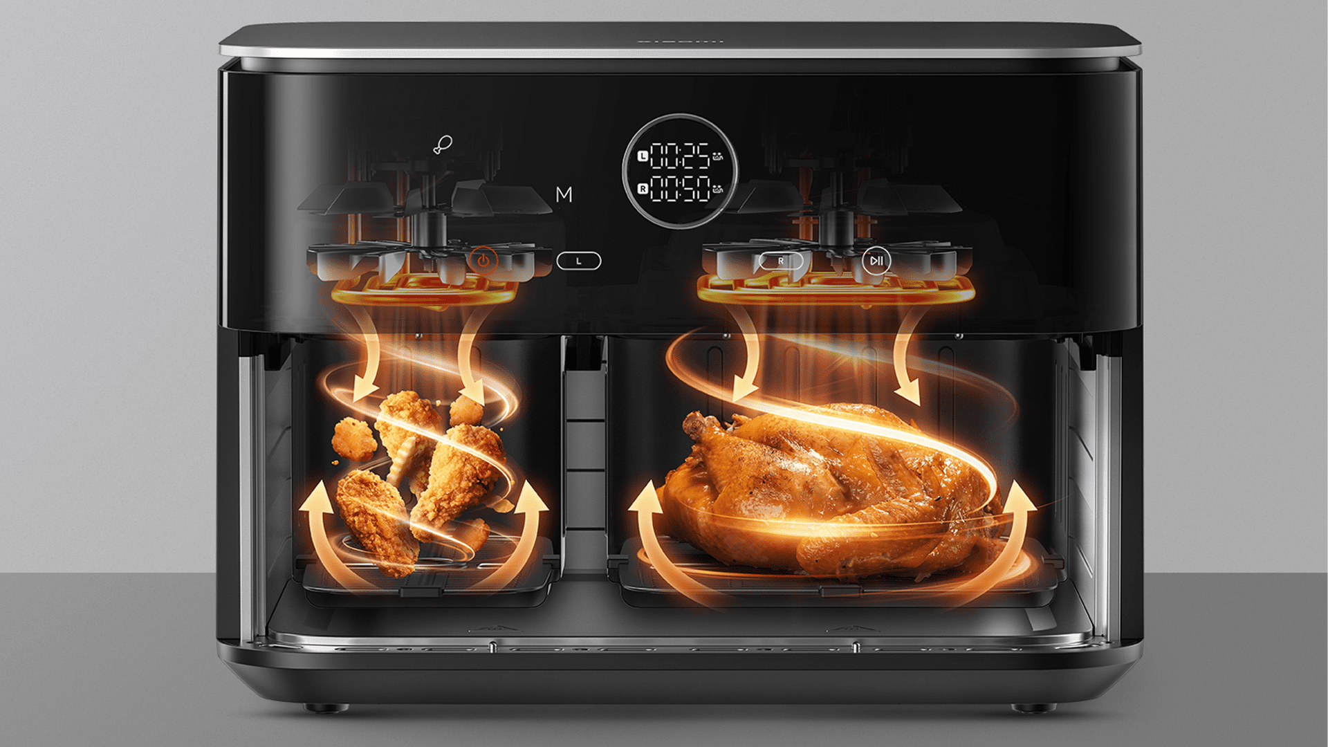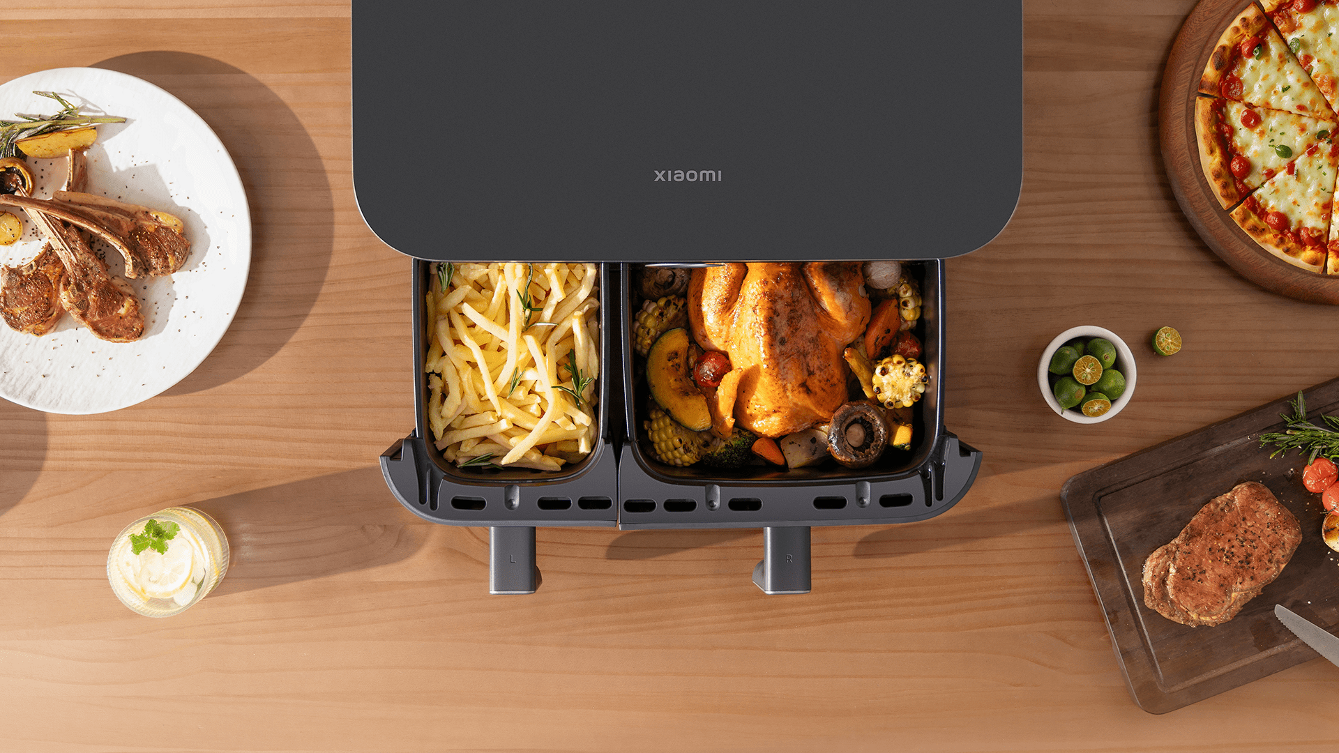 Xiaomi Dual Zone Air Fryer 10L využíva inovatívnu konštrukciu dvoch samotných fritovací košov s celkovou kapacitou 10 litrov. Skladá sa z ľavého koša s objemom 3,5l určeného na prílohy a pravého koša s objemom 6,5 litra na prípravu hlavných jedál. Vo fritéze tak viete jednoducho a naraz pripraviť aj celé kurča a kompletné jedlá s prílohou.