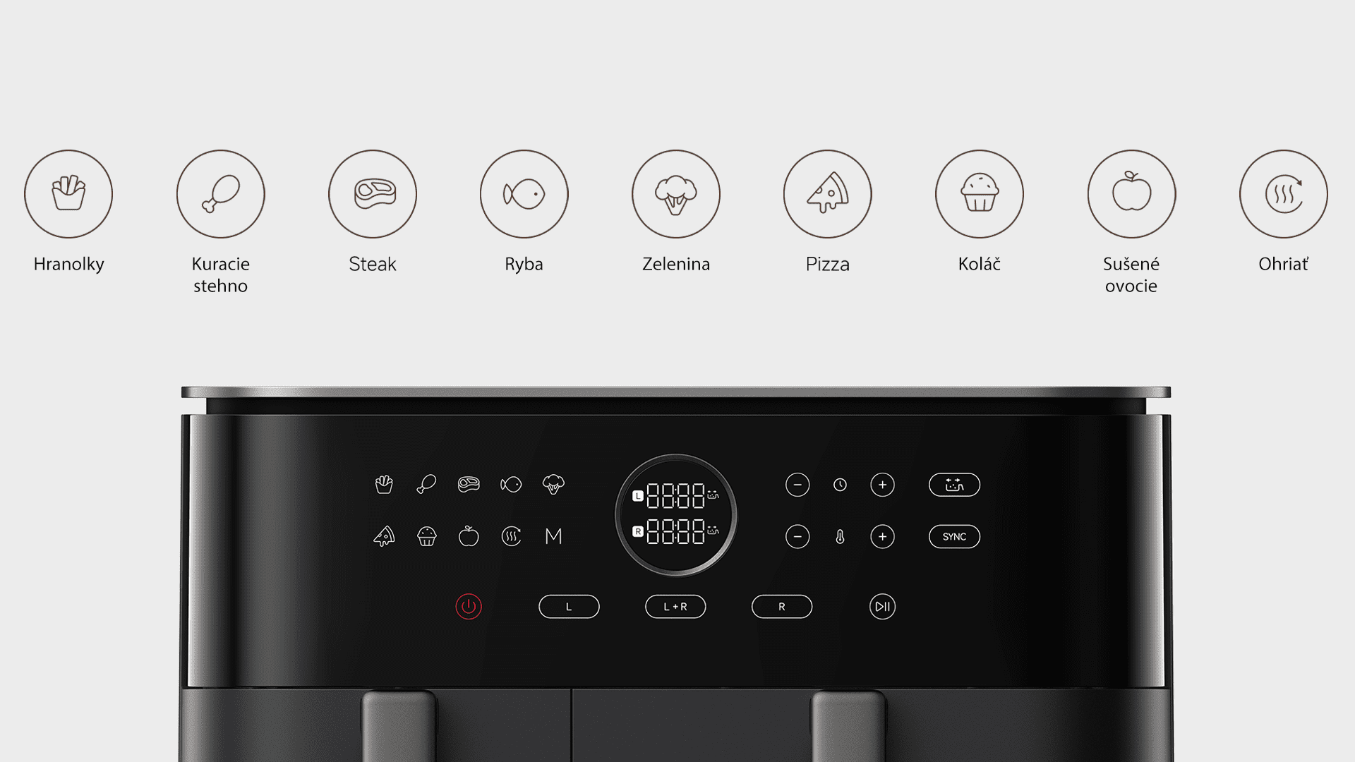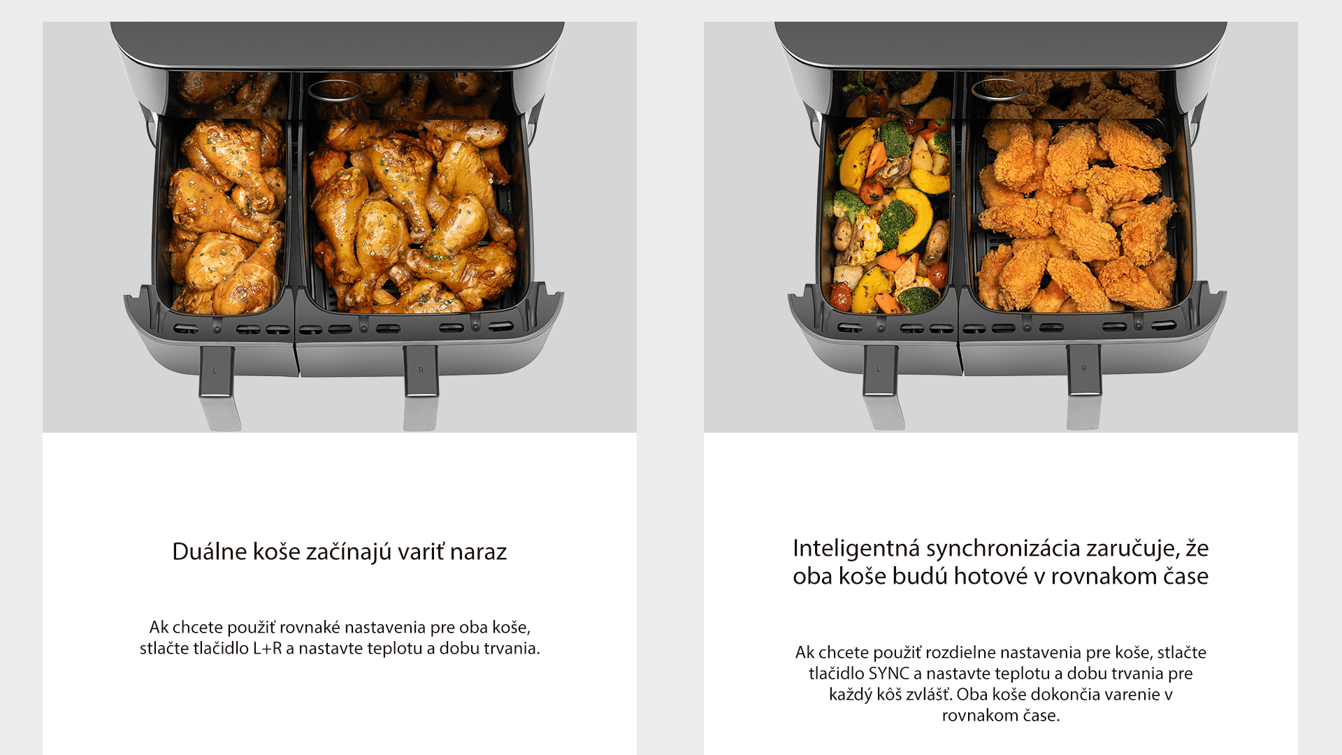 Podľa typu pokrmu a veľkosti porcii si môžete vybrať či chcete pripravovať jedlá v oboch košoch naraz s rovnakými nastaveniam pre oba, stlačením L+P tlačidla, alebo chcete použiť rozličné nastavenia pre oba koše samostatne. V takom prípade môžete využiť funkciu SYNC (stlačením príslušného tlačidla) a vybrať si teplotu a trvanie varenia samostatne. Oba koše dokončia varenie súčasne aby ste si mohli vychutnať svoje pokrmy chutné, čerstvé a teplé.