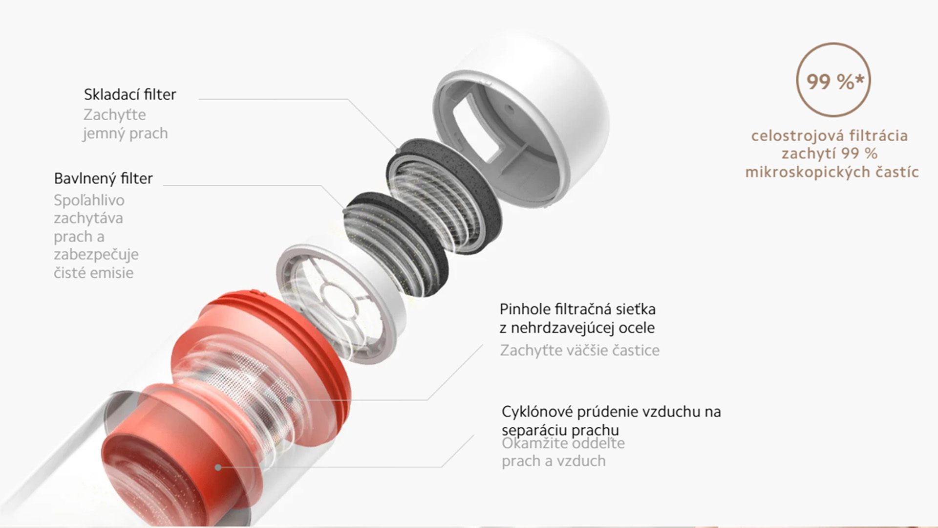 Využíva vylepšenú cyklónovú separáciu a prietok vzduchu v kombinácii, s filtračnou sieťkou z nehrdzavejúcej ocele, filtrom jemný prachový častíc a bavlneným filtrom. Efektívne odstraňuje jemný prach, roztoče a ďalšie alergény. Tým zabraňuje ich opätovnému rozptýleniu do ovzdušia a minimalizuje riziko sekundárneho znečistenia.