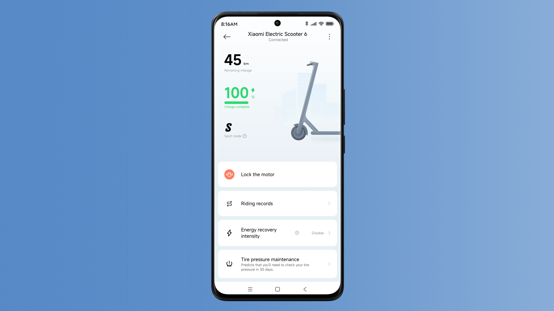 „Pripojte sa k aplikácii Xiaomi Home a využívajte smart funkcie naplno. Sledujte svoje štatistiky, zostavujúci dojazd, aktuálnu úroveň batérie, režim jazdy, úroveň rekuperácie, alebo uzamknite a odomknite motor.