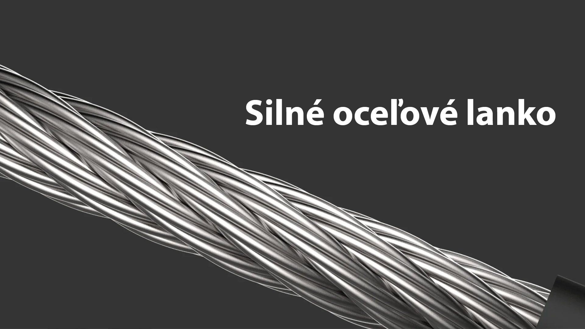 1200 mm silné oceľové lano, ktoré vydrží zaťaženie až 1500 N.