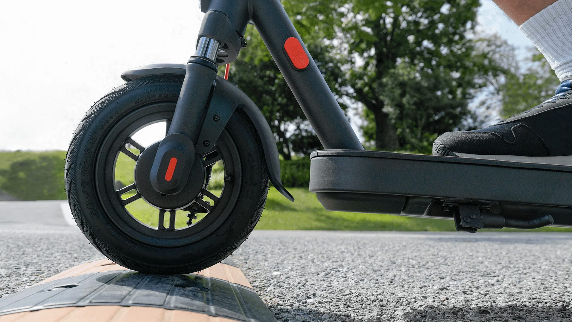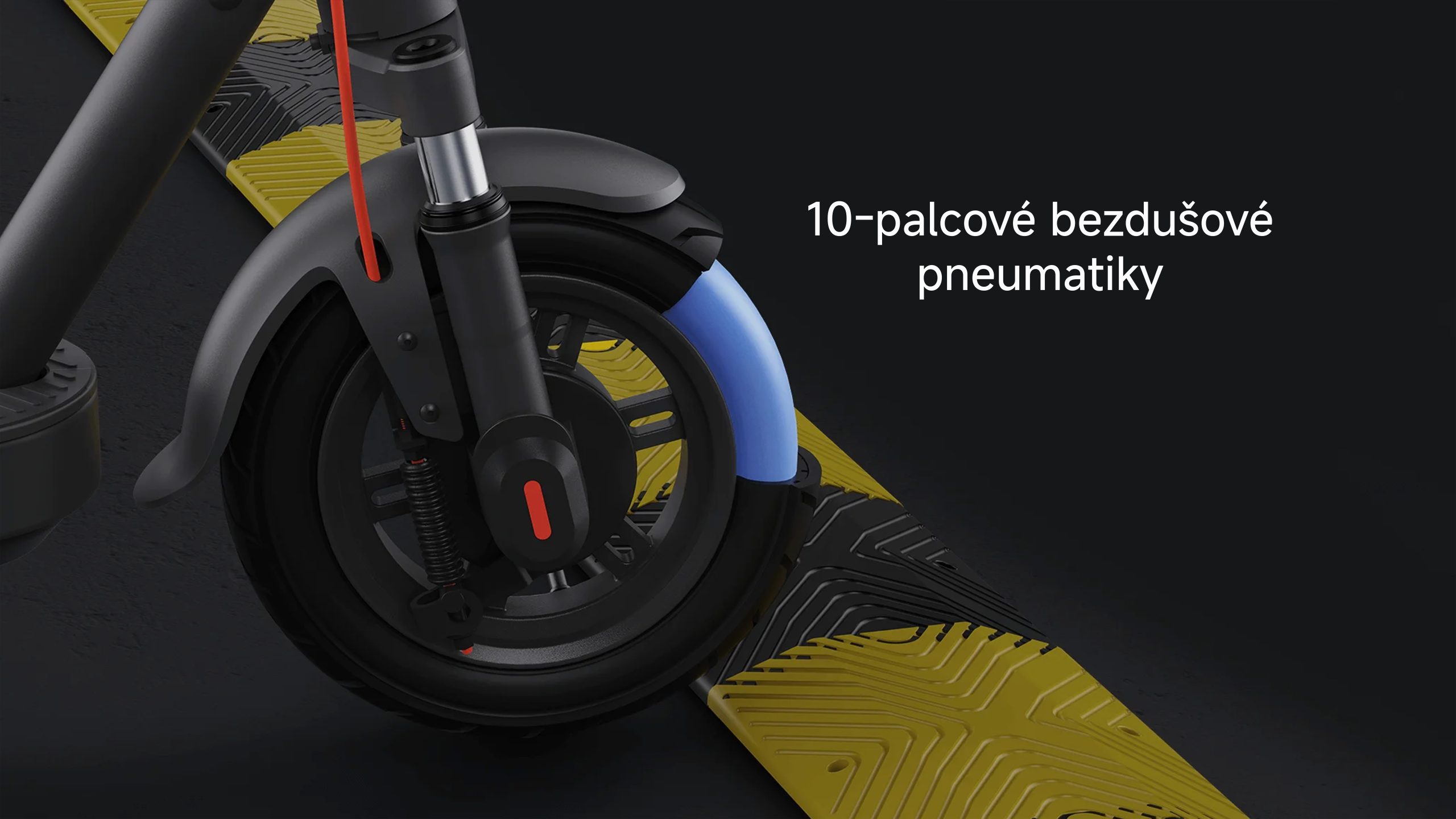 V porovnaní s bežnými pneumatikami s menším priemerom, 10-palcové bezdušové pneumatiky s nízkym odporom, ponúkajú väčšiu vzdialenosť od vozovky, lepšiu prejazdnosť, stabilitu v zákrutách a dlhšiu životnosť batérie.