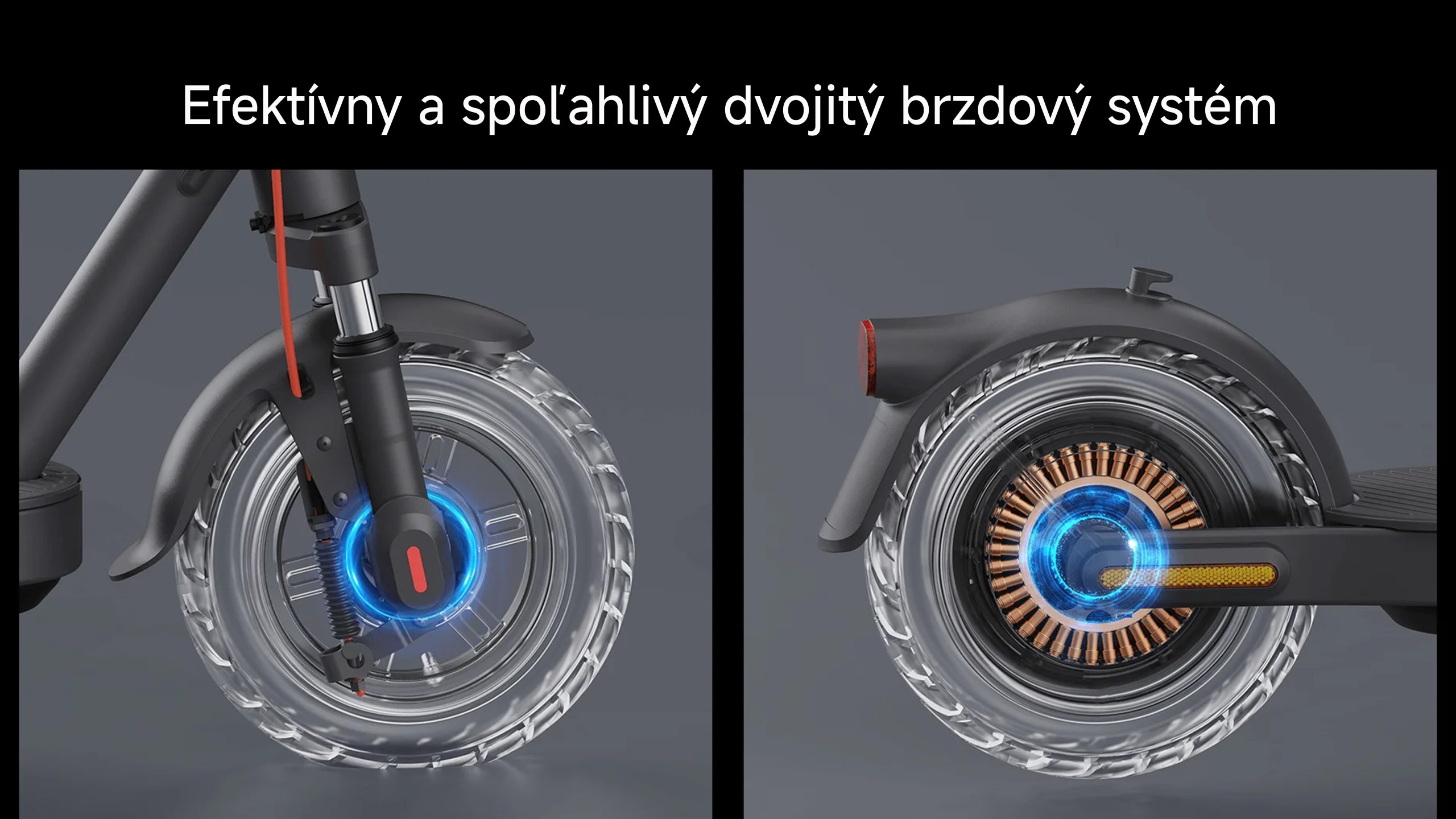 Bubnová brzda predného kolesa a E-ABS motora zadného kolesa, spolu spolupracujú na skrátení brzdnej dráhy a zvýšení vašej bezpečnosti pri brzdení.