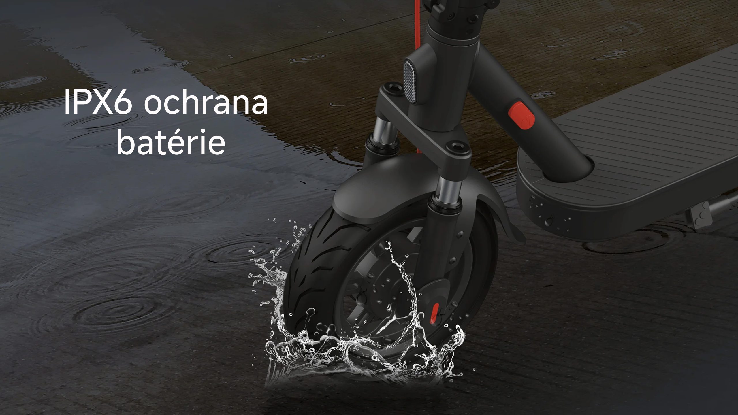 Kolobežka je vybavená vodeodolnosťou IPX5, vďaka čomu účinne odoláva striekajúcej vode a je vhodná na použitie aj v sychravom a upršanom počasí. Samotnú batériu navyše chráni zvýšená vode-odolnosť IPX6.