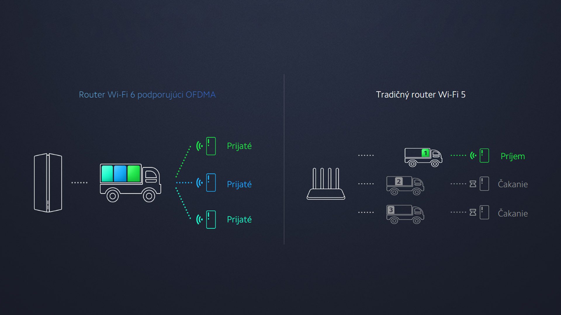 Technológia OFDMA umožňuje routerom spracovávať dátové toky z viacerých zariadení súčasne, tým sa účinne znižuje preťaženie siete a výrazne sa znižuje latencia.