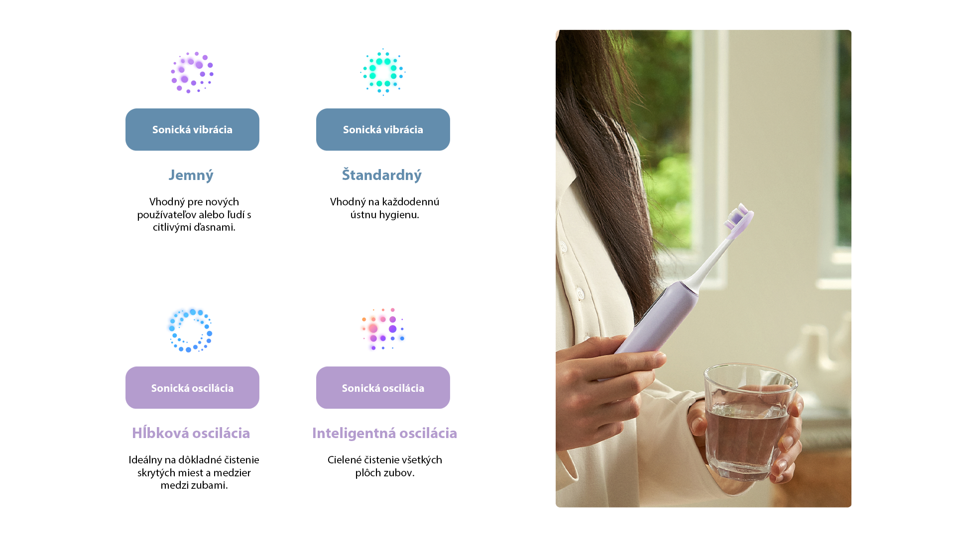 Vyberte si ten, ktorý vám vyhovuje, podľa vašich individuálnych potrieb. Gentle (Šetrný) – Vhodný pre nových používateľov alebo osoby s citlivými ďasnami. Štandard – Vhodný pre každodennú ústnu hygienu. Deep oscillation (Hĺbkové čistenie) – Vhodný na hlboké čistenie ťažko dostupných medzizubných priestorov. Smart (inteligentný) – Vhodný na cielené čistenie rôznych povrchov zubov