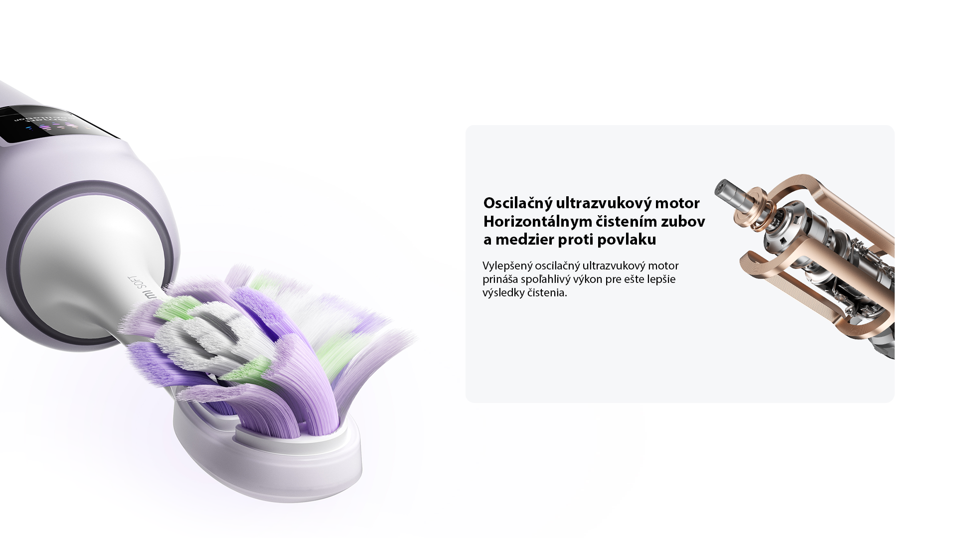 Zubná kefka dosahuje uhol oscilácie až 20°, v súlade s Bassovov technikou čistenia, čim poskytuje väčší rozsah oscilácie a vyššiu účinnosť čistenia zubov a ďasien. Vylepšený ultrasonický motor poskytuje spoľahlivý výkon pre lepšie výsledky čistenia zubného povlaku.