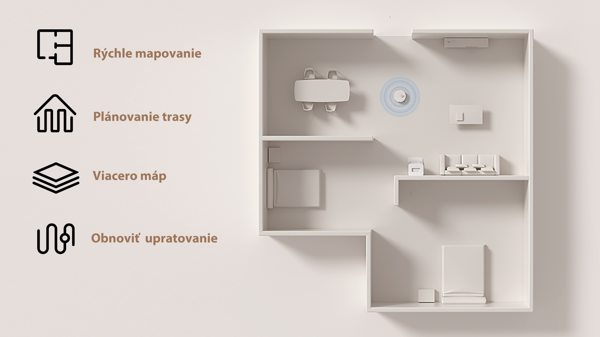 Vďaka špičkovej laserovej navigácii LDS vykonáva vysávač 360° skenovanie vášho domova a rýchlo vytvára presnú mapu. Zapamätá si rozloženie pre bezproblémové čistenie bez potreby opakovaného skenovania.