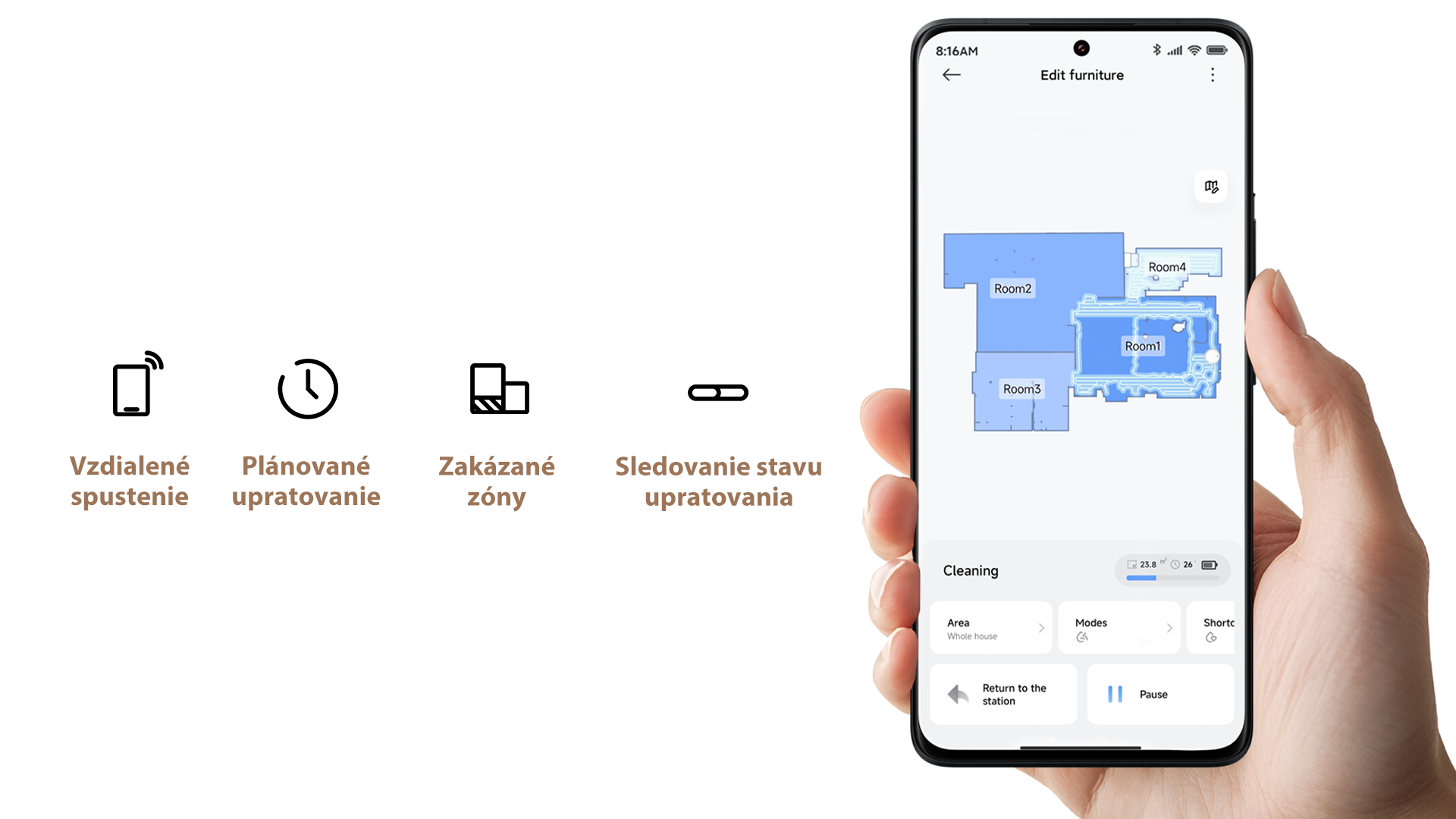 V aplikácii Xiaomi Home stačí jednoducho klepnúť na kus nábytku a vysávač okamžite vyrazí upratať v jeho okolí. Rozsypaná káva v kuchyni alebo omrvinky pod stolom už nebudú žiadny problém.