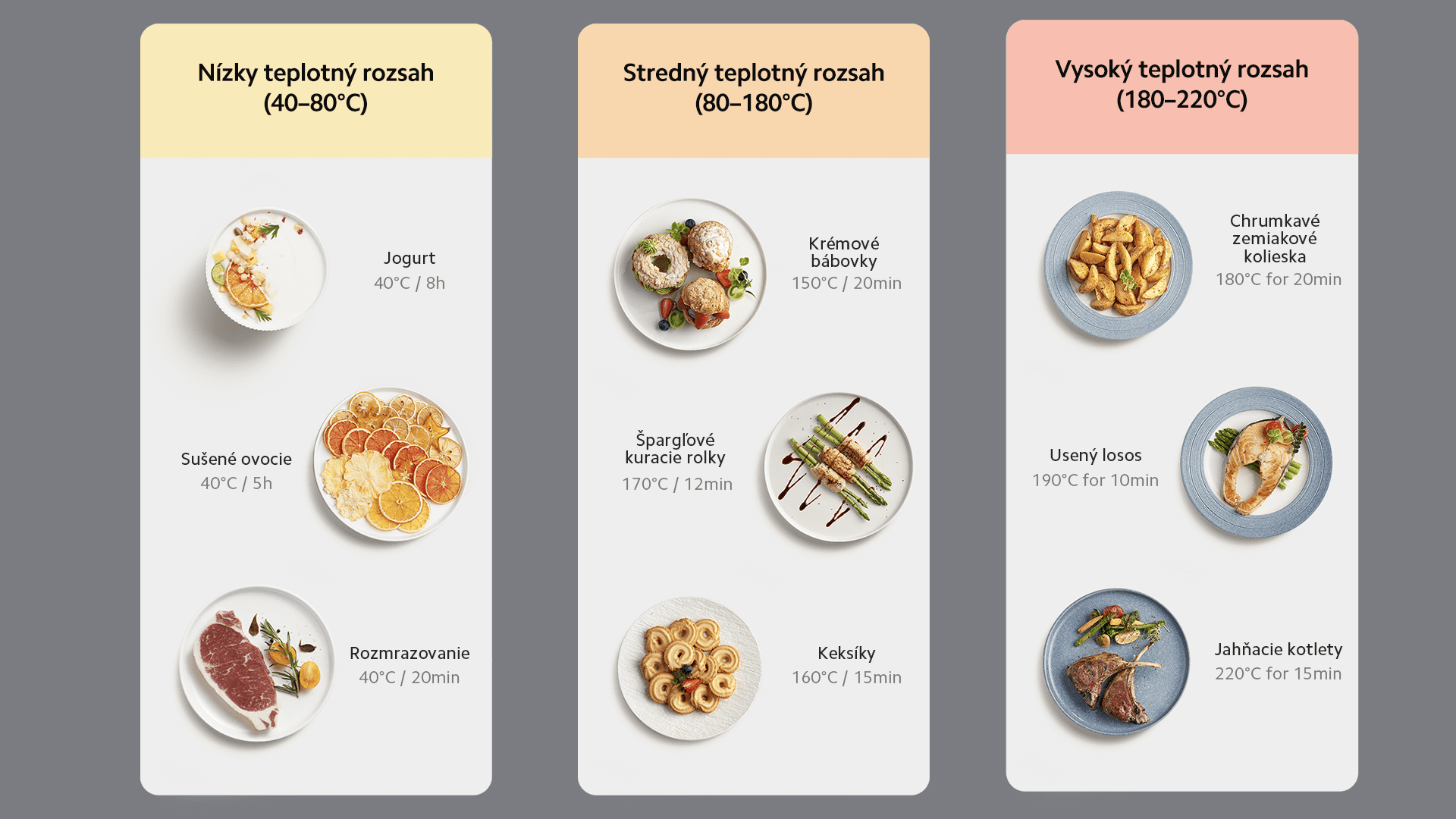 Zabudovaná technológia inteligentnej regulácie teploty presne monitoruje teplotu počas procesu varenia. Zabraňuje tak pripáleniu a nedostatočnému uvareniu. S minimálnou teplotou 40°C dokáže udržiavať stálu teplotu pri rozmrazovaní, fermentácii aj pri sušení ovocia. S maximálnou teplotou 220°C vyniká pri pečení, smažení a zapekaní.