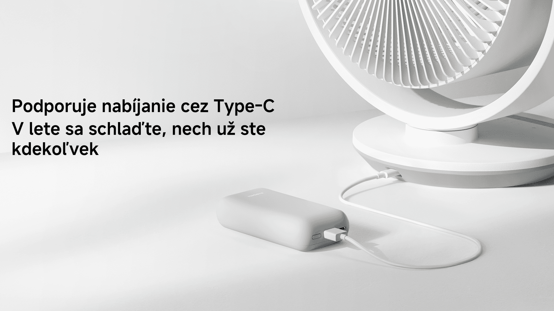 Ventilátor je vybavený univerzálnym nabíjacím konektorom USB-C s podporou rôznych spôsobov nabíjania. Ventilátor tak môžete nabíjať pomocou pribaleného 18W adaptéra alebo powerbanky. *10 000mAh powerbanka Xiaomi dokáže poskytnúť až 26 hodín nepretržitého napájania ventilátora.