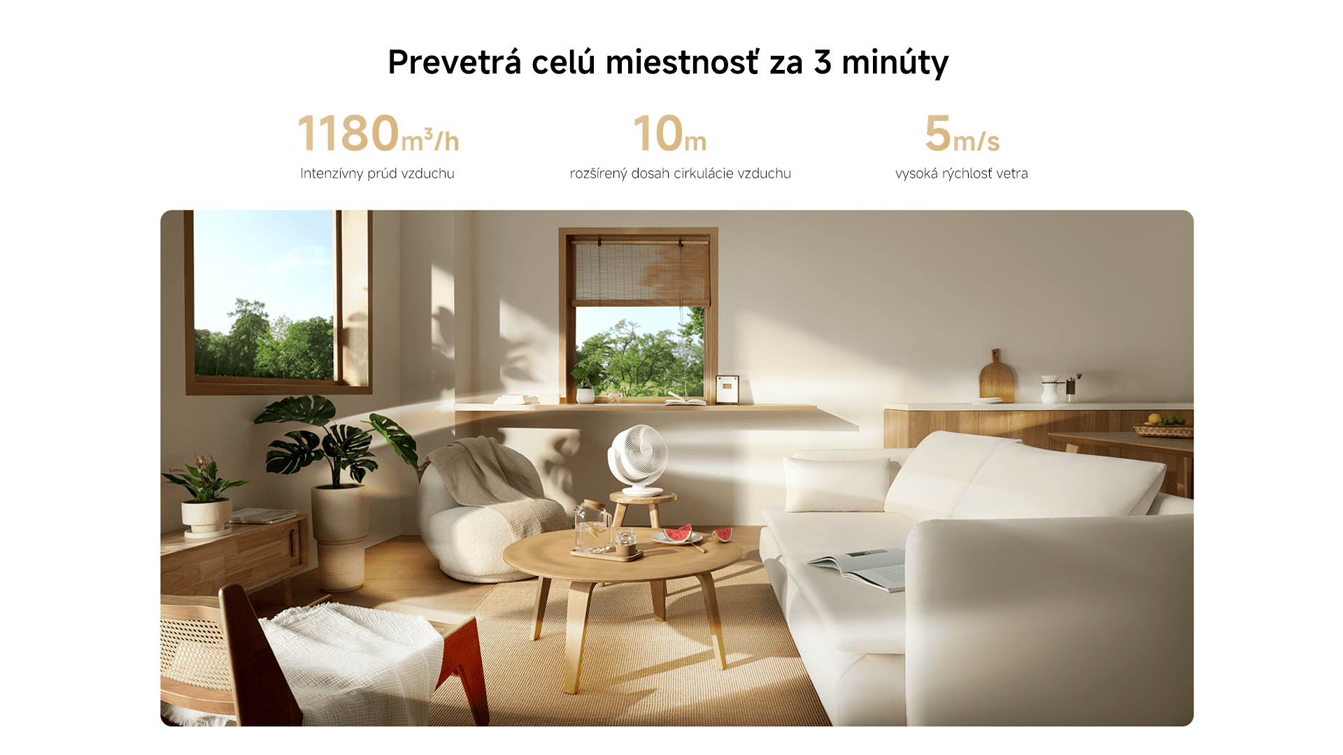 Napriek kompaktný rozmerom, ventilátor poskytuje vysoký prietok vzduchu (1180 m³/h), čím zabezpečuje rýchlejšie vetranie a lepšiu cirkuláciu vzduchu v interiéri. Vďaka efektívnemu dosahu až 10m a rýchlosti vzduchu 5m/s, si ľahko poradí aj s väčšími priestormi.