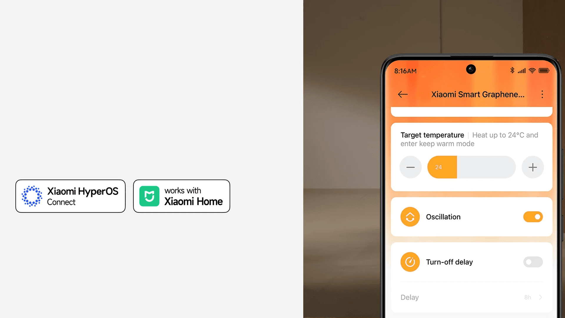Inteligentný ohrievač Xiaomi Smart Graphene Heater ponúka viaceré možnosti ovládania. Nechýba ani ovládanie mobilom s aplikáciou chytrej domácnosti Xiaomi Home, či prepojenie inteligentných zariadení Xiaomi HyperOS Connect, Hlasové ovládanie a podpora Google Home a samozrejmosťou je aj prehľadné dotykové ovládanie na vrchnej časti zariadenia.