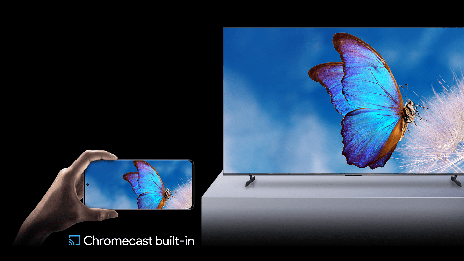 Okrem technológie Miracast môžete vďaka vstavanému zariadeniu Chromecast™ jednoducho prenášať filmy, relácie, fotografie a ďalší obsah z telefónu alebo tabletu priamo do televízora.