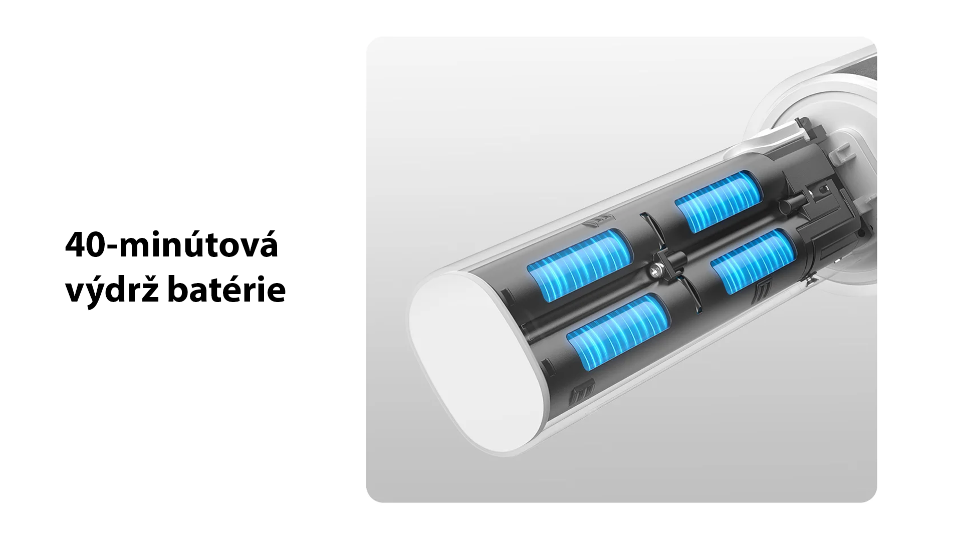 Štvorica lítium-iónových batérii s celkovou kapacitou 2000mAh a dva režimy vysávania poskytujú až 40 minút nepretržitého upratovania a 10 minút vysoko účinného vysávania v Turbo režime.