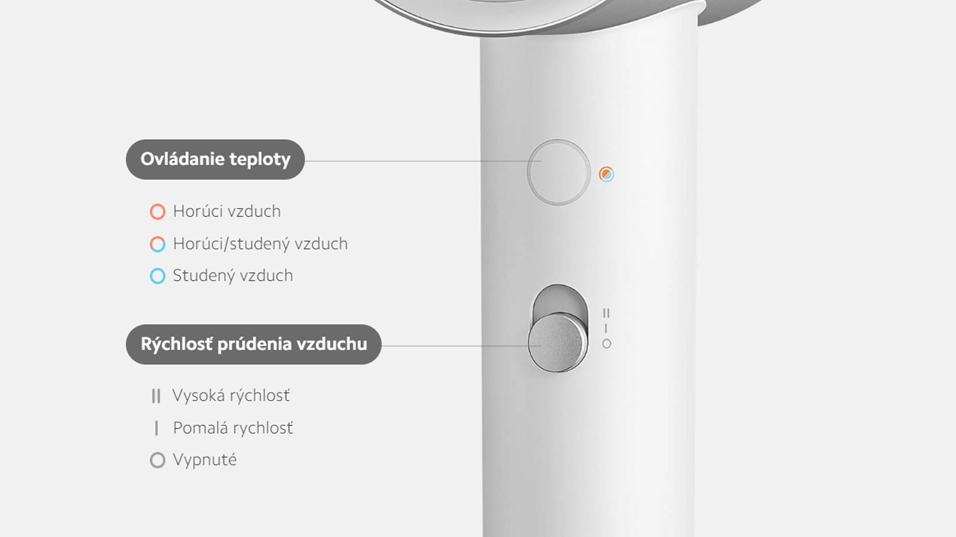 Tri nastavenia teploty umožňujú prepínať medzi horúcim a studeným vzduchom a dva stupne rýchlosti vám poskytujú väčšiu kontrolu nad sušením vlasov. Keď je teplota vzduchu nastavená na horúcu alebo studenú, dvojfarebný LED indikátor príslušne zmení farbu. Nastavenie teploty sa automaticky zachová a uloží pre ďalšie použitie.