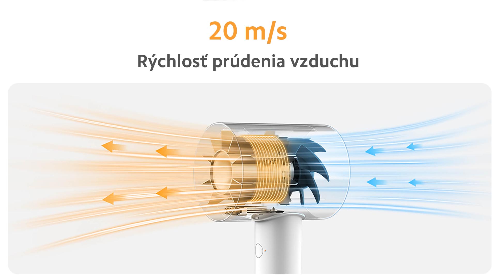 Sušič vlasov Xiaomi Water Ionic Hair Dryer H500 je vybavený jednosmerným vysokorýchlostným motorom s rýchlosťou 20 000 ot./min. a 7 krídlovými lopatkami. Najvyššia rýchlosť prúdenia vzduchu je 20 m/s, čo umožňuje silnému prúdu vzduchu dosiahnuť až ku korienkom a rýchlo vysušiť vlasy bez akéhokoľvek poškodenia.